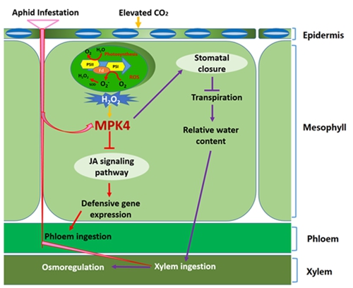 大气CO2浓度升高不仅通过影响植物的光合作用提高作物产量,还对植物抗虫性产生深刻影响。过去研究表明,CO2浓度升高会降低植物的茉莉酸和乙烯信号途径,有利于刺吸式口器昆虫种群发生,但对于植物抗虫激素途径的上游调控一直不清楚。中科院动物所戈峰研究组的孙玉诚博士、郭慧娟博士以蚜虫和转基因烟草为材料,研究大气CO2浓度升高对植物抗蚜信号上游调控的影响,发现大气CO2浓度升高会特异性增加植物丝裂原活化蛋白激酶MPK4的表达,对MPK3和MPK6没有影响。而MPK4的增加一方面抑制下游茉莉酸信号途径的表达,降低植物对蚜虫的有效抗性;另一方面诱导气孔闭合增加植物水势和水分含量,有利于提高蚜虫的取食效率,此研究揭示MPK4是植物响应大气CO2浓度升高和蚜虫侵染的关键节点,利用“双管齐下”的双重调节方式有利于蚜虫的种群发生。相关研究在线发表在Journal of Experimental Botany (Up-regulation of MPK4 increases the feeding efficiency of the green peach aphid under elevated CO2 in Nicotiana attenuata. doi:10.1093/jxb/erx394)