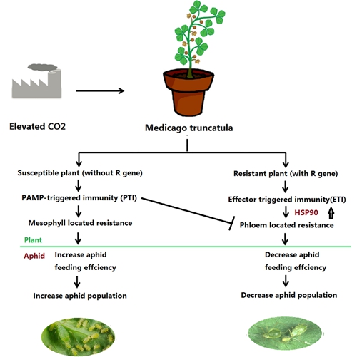 不仅如此,进一步利用中国科学院动物所小汤山全球气候变化研究基地的野外12个大型开顶式CO2模拟控制气室,对更为上游的植物抗蚜信号途径的受体进行探究,基于蛋白组学和基因表达发现大气CO2浓度升高通过增加植物HSP90及其伴侣分子SGT1和RAR1的表达,有利于增强R-gene介导的抗虫信号(NBS-LRR跨膜保守序列),并增加茉莉酸信号途径和泛素化介导的蛋白降解途径,不利于蚜虫的取食和种群发生。且通过VIGS干扰HSP90的表达后,降低了具有R抗性基因植物的茉莉酸信号和泛素化介导的蛋白降解途径,削弱了对蚜虫取食为害的有效抗性。此项研究首次阐明了大气CO2浓度升高通过增加HSP90表达提高R-gene介导的抗性,揭示CO2浓度升高对寄主植物PTI和ETI抗性反向效应的分子基础。相关研究在线发表在New Phytologist (Elevated CO2 increases R gene-dependent resistance of Medicago truncatula against the pea aphid by up-regulating a heat shock gene. doi: 10.1111/nph.1489)。