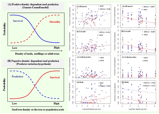 经典的负密度制约模型(即Janzen-Connell model)预测常见物种的种子捕食率与母树的距离或者同种种群密度呈负相关。 但相反,捕食者饱和假说(predator satiation hypothesis)预测在种子产量丰年或种子丰富的区域有较低的种子捕食率。昆虫种子捕食系统提供了一个很好的系统来验证上述假设(图2)。