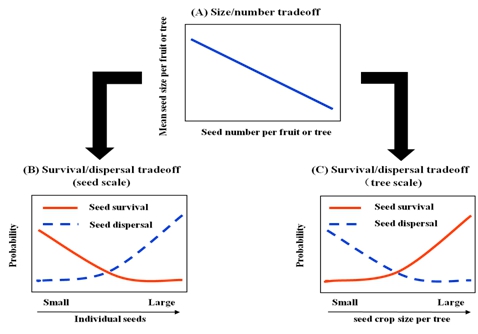 图7 种子大小与数量权衡及种子扩散与存活权衡机制