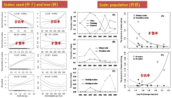 通过在四川都江堰对油茶种子产量、种子大小、鼠类密度和种子命运等进行了多年的调查研究,发现在种子歉收年份,更多种子为鼠类所贮藏,扩散距离更远,并有更多贮藏的种子存活到种子萌发和幼苗建成(图7和图8)。但随着种子产量或种子相对丰度增加,种子的搬运速率减慢,贮藏种子的比例降低,扩散距离更近,且二次贮藏的比例也降低,并有更多种子在原地存活,但被贮藏种子的存活率也较低(Journal of Ecology, 2013)。发现在种子水平上大种子有利于扩散,而小种子有利于存活;但在树或种群水平上表现为种子产量低有利于扩散(与捕食者扩散假说不一致),而种子产量高更有利于存活(与捕食者饱和假说一致)(Forest Ecology and Management 2015)。